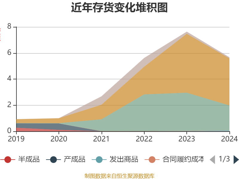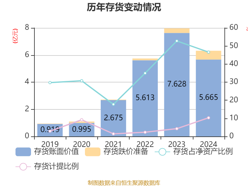 从存货变动来看,截至2024年末,公司存货账面价值为5.67亿元,占净资产的46.61%,较上年末减少1.96亿元。其中,存货跌价准备为6498.37万元,计提比例为10.29%。