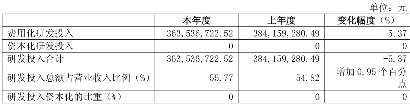 2024年全年,公司研发投入金额为3.64亿元,同比下降5.37%;研发投入占营业收入比例为55.77%,相比上年同期上升0.95个百分点。此外,公司全年研发投入资本化率为0%。