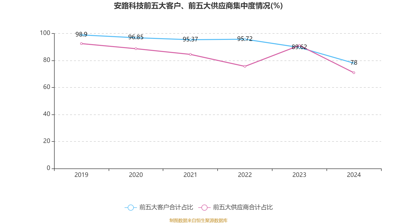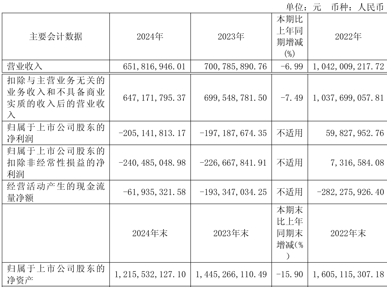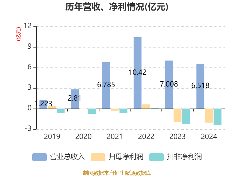 中证智能财讯安路科技(688107)4月26日披露2024年年度报告。2024年,公司实现营业总收入6.52亿元,同比下降6.99%;归母净利润亏损2.05亿元,上年同期亏损1.97亿元;扣非净利润亏损2.4亿元,上年同期亏损2.27亿元;经营活动产生的现金流量净额为-6193.53万元,上年同期为-1.93亿元;报告期内,安路科技基本每股收益为-0.5118元,加权平均净资产收益率为-15.42%。