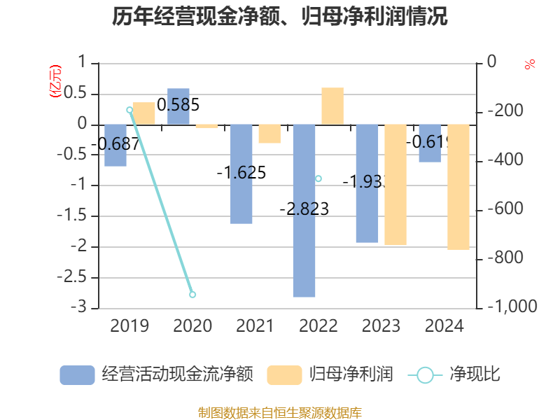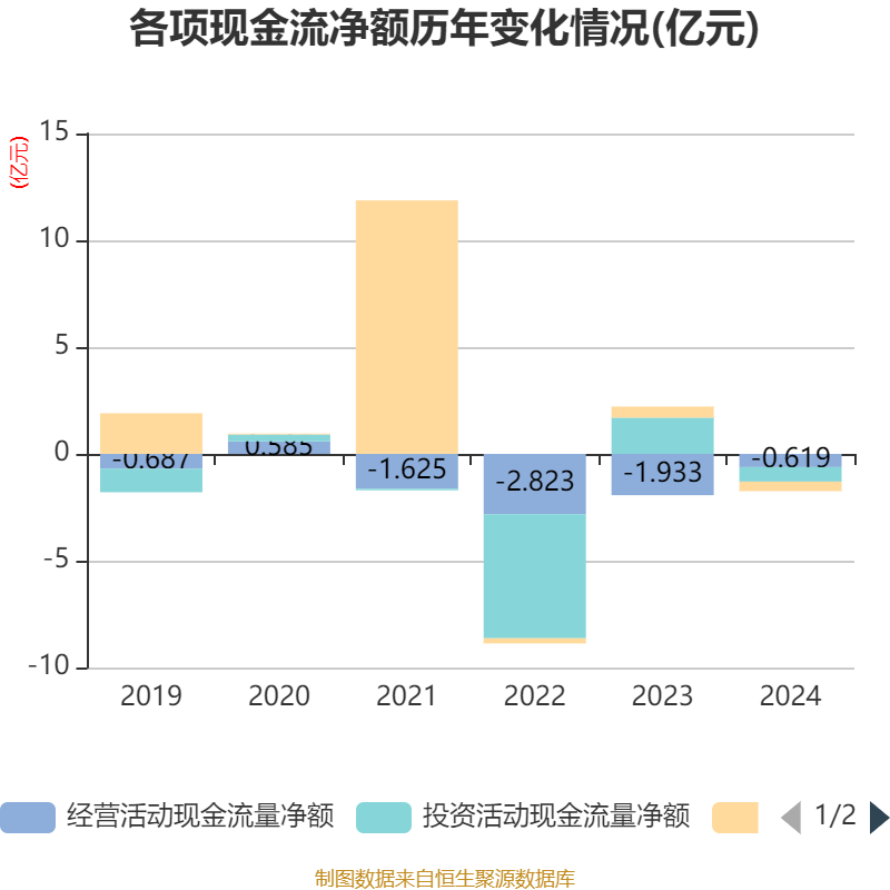截至2024年,公司经营活动现金流净额为-6193.53万元,同比增加1.31亿元;筹资活动现金流净额-4462.51万元,同比减少9656.52万元;投资活动现金流净额-6790.25万元,上年同期为1.7亿元。