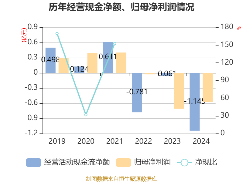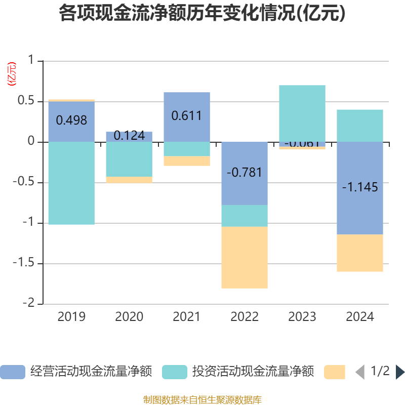 截至2024年,公司经营活动现金流净额为-1.14亿元,同比减少1.08亿元;筹资活动现金流净额-4589.04万元,同比减少4254.05万元;投资活动现金流净额3962.63万元,上年同期为6976.74万元。