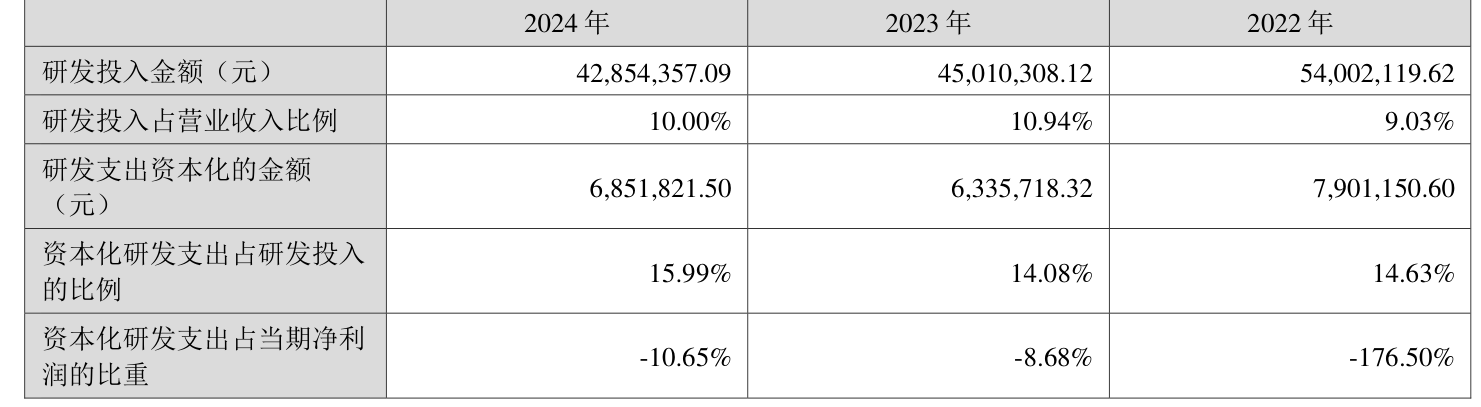2024年全年,公司研发投入金额为4285.44万元,同比下降4.79%;研发投入占营业收入比例为10%,相比上年同期下降0.94个百分点。此外,公司全年研发投入资本化率为15.99%。