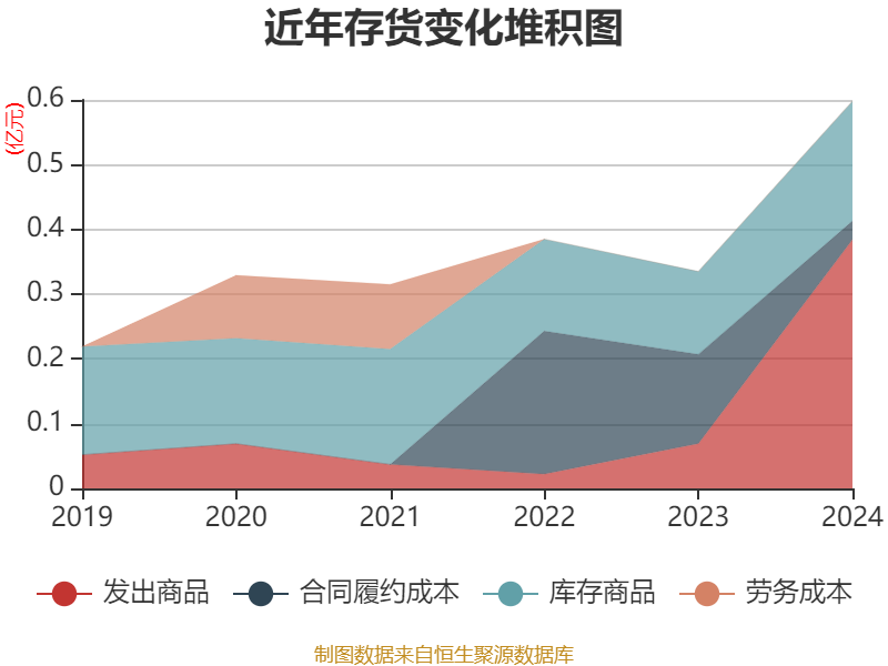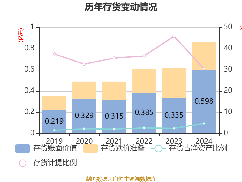 从存货变动来看,截至2024年末,公司存货账面价值为5979.46万元,占净资产的4.68%,较上年末增加2625.38万元。其中,存货跌价准备为2614.03万元股E融,计提比例为30.42%。