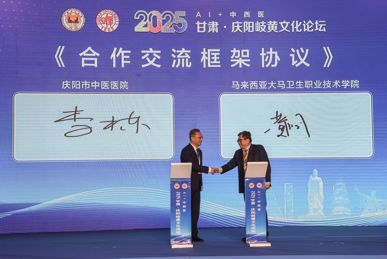 本次论坛以“人工智能+中西医结合”为主题,由庆阳市委市政府和复旦大学中西医结合研究院联合举办,开展主旨报告、学术报告、交流研学、主题访谈、拜谒医祖岐伯、名医义诊及中医诊疗康养体验等多项活动。其间,庆阳市政府与马来西亚雪兰莪州政府签署《开展算力合作意向书》,庆阳市中医药学会、庆阳市岐黄文化研究会与马来西亚马六甲州中医师公会、马来西亚郑和文化研究院签署《关于共同推动岐黄文化和中医药产业事业传承创新发展战略合作框架协议》,庆阳市中医医院与马来西亚大马卫生职业技术学院签署《合作交流框架协议》,庆阳神州同泰医药公司与马来西亚龙马进出口公司签署《外贸采购合作协议》。